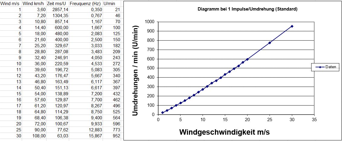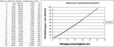 Diese Tabelle oben zeigt die Abhängigkeit der erzeugten Frequenz des Reedkontaktes bei der jeweiligen Windgeschwindigkeit. Die Grafik zeigt die Abhängigkeit U/min von der Windgeschwindigkeit.